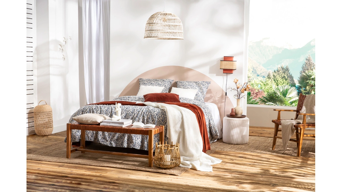 Pour être pile dans la tendance décoration d’intérieur ethnique chic, on l’associe à d’autres pièces de mobilier inspirées d’ailleurs. Un joli tapis berbère viendra apporter un supplément de caractère.