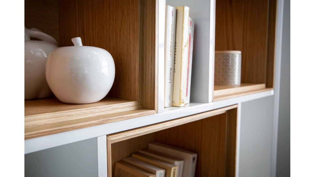 La dissymétrie des 18 niches qui composent cette bibliothèque haute aux dimensions L85 x P30 x H212 cm apporte une touche d’originalité et habillera un séjour, une chambre ou une entrée avec style. Cette bibliothèque scandinave mixe une structure blanche en panneaux de fibres de bois et des casiers finition chêne. Un élégant rappel du style nordique à la fois chaleureux et épuré pour cette bibliothèque blanche et bois ! Mais ce qui fait toute la singularité de cette bibliothègue étagère ce sont ses niches modulables. En effet, les casiers chêne peuvent être déplacés au gré de vos envies !