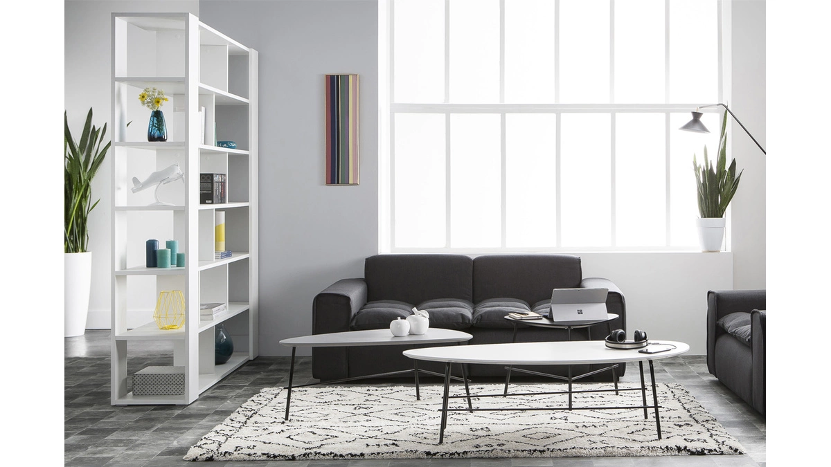 La bibliothèque MUSSO c’est une structure massive à utiliser dans un séjour ou une chambre pour diviser deux espaces. Elle réunit des dimensions XXL et une accumulation de rangements fonctionnels ; une recette qui fonctionne à tous les coups ! Séparateur idéal pour un salon-salle à manger ou une chambre-bureau, le meuble MUSSO se fixe aussi contre un mur pour profiter d’une bibliothèque grand format. Ses rangements asymétriques apporteront une belle touche de modernité à la décoration de la pièce. La bibliothèque MUSSO est un meuble au design original qui a tout pour devenir un indispensable de nos intérieurs contemporains.