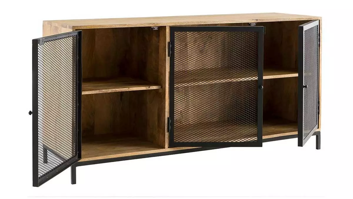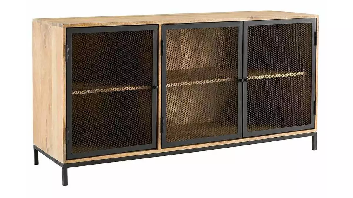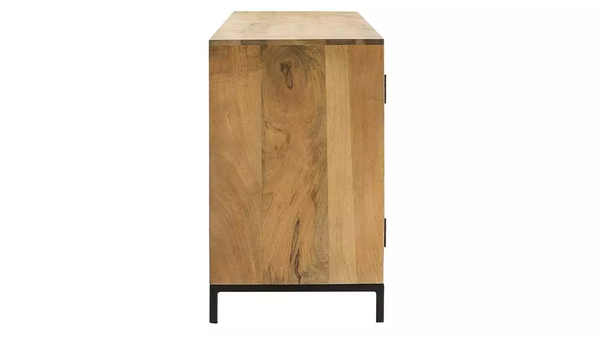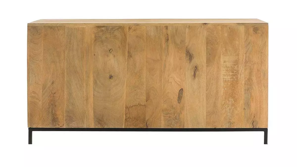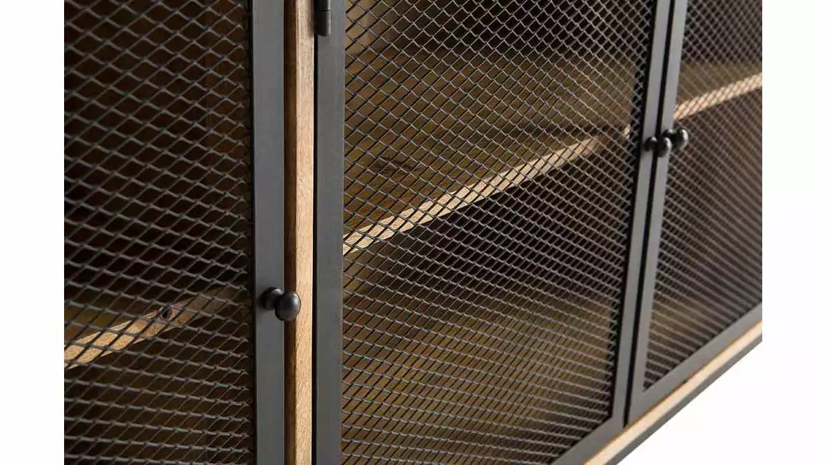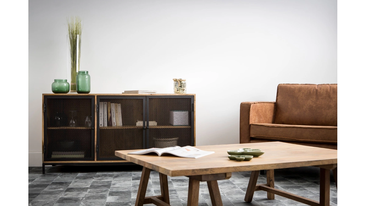Les matériaux qui composent ce buffet sont un subtil mélange d’exotisme et de style industriel. Le manguier du meuble RACK est un bois apprécié en décoration pour ses tons chauds et ses stries caractéristiques. Cette élégante structure en bois est accompagnée d’un piètement et de portes en métal inspirés du style factory. Ce qui rend ce buffet bas unique c’est le travail des matières, notamment le métal perforé des portes qui permet de fermer les niches tout en donnant de la légèreté à ce meuble en bois massif.