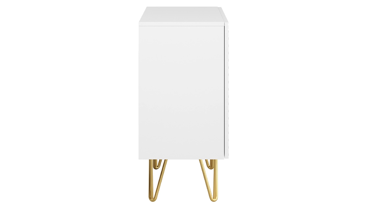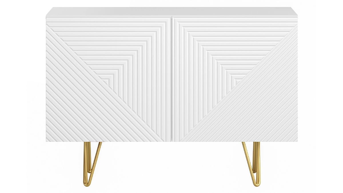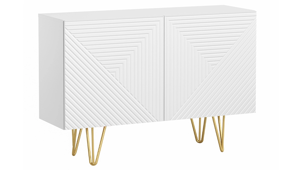Décoré en façade par un motif chevronné en relief et parti pris d’un design moderne, ce meuble de rangement blanc mat est subtilement surmonté par 4 pieds métalliques doré mat. À l’inspiration vintage, le piètement épingle confère à l’ensemble une silhouette aérienne et épurée. Matières et couleurs forment un délicat duo sans fausse note qui se démarquera autant dans une ambiance déco contemporaine que rétro chic.