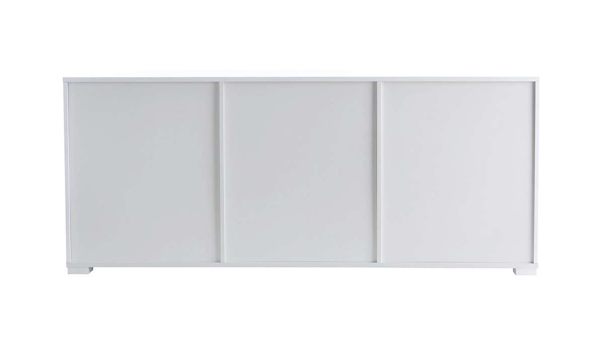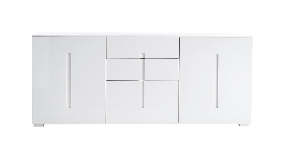 Avec des dimensions importantes, ce buffet TED possède de multiples rangements. Dans chaque extrémités, deux grandes niches sont dotées d’une étagères réglables sur 3 hauteurs. Ces rangements sont idéaux pour déposer assiettes, verres ou porcelaine. L’espace central se compose de 3 tiroirs dont deux de la même taille (L59 x P34 x H18 cm) et un plus grand situé dans la partie basse du meuble (L59 x P34 x H36 cm) idéal pour ranger des plats. Les portes ainsi que les tiroirs s’ouvrent à l’aide de l’ouverture design dessinée sur la façade du buffet.