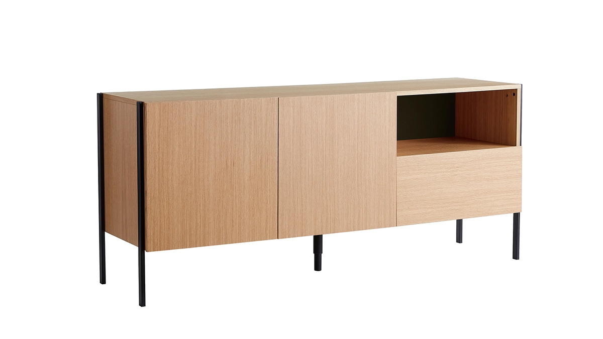 Si le piètement en métal noir flirte subtilement avec les codes du mobilier industriel, la structure en bois clair à l’inspiration scandinave apportera une touche chaleureuse à votre intérieur. D’une élégante simplicité, la silhouette indémodable et discrète de ce buffet moderne en bois s’intégrera avec aisance dans de nombreux univers déco.