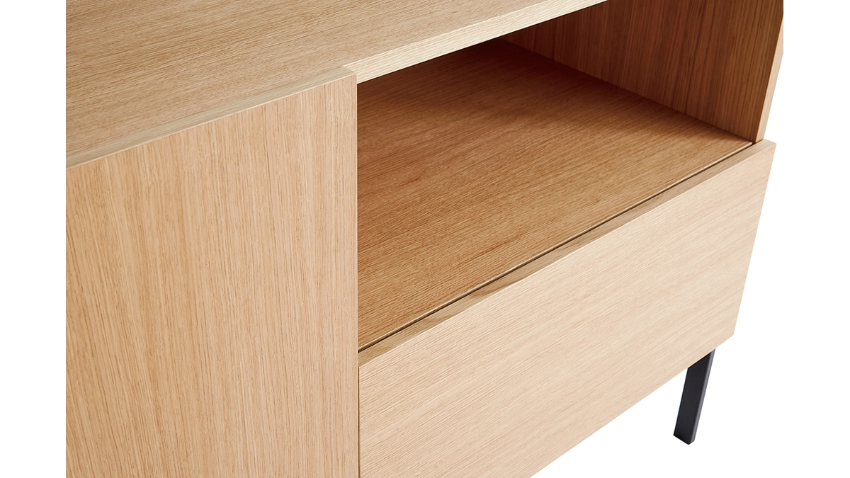 Matières : Panneaux de fibres de bois placage chêne, plateaux séparateur de niches en mélamine teinté noir, pieds en métal