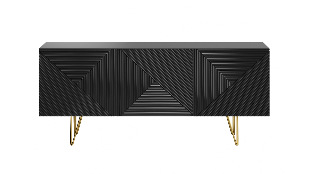 Avec le buffet OZEN, les intérieurs contemporains ont trouvé leur perle rare ! Petit bijou de design, ce buffet moderne se démarque par son originalité. Les trois portes sont ornées d’un magnifique motif géométrique en relief ton sur ton. Atypique mais discret, il fait toute l’élégance de ce meuble de rangement. Le noir immaculé de la structure est réhaussé par un piètement épingle en métal doré. Ce détail chic et coloré est travaillé avec finesse pour un style tout en légèreté.