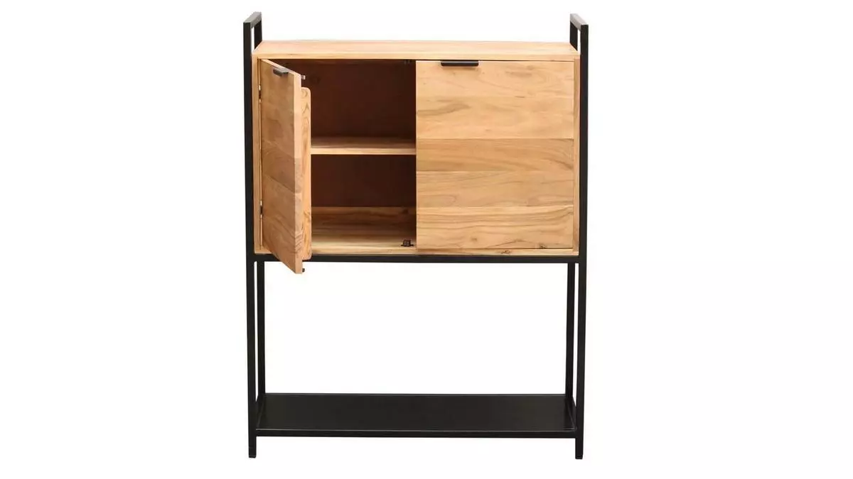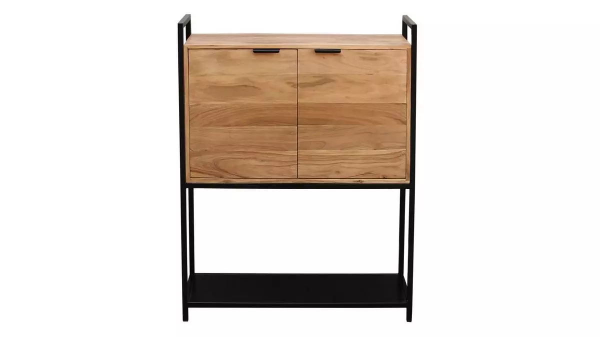 Véritable caméléon, ce buffet haut (L85 x P40 x H110 cm) s’intègre dans toutes les pièces. On l’imagine aussi bien dans un séjour à la décoration vintage que dans une entrée ou une chambre. La fine structure supporte un élément de rangement en acacia massif (L77 x P36 x H47 cm) qui s’ouvre à l’aide de fines poignées ainsi qu’une étagère en métal noir. On aime particulièrement les lignes graphiques et aériennes de la structure en métal noir qui présentent une grande légèreté visuelle.