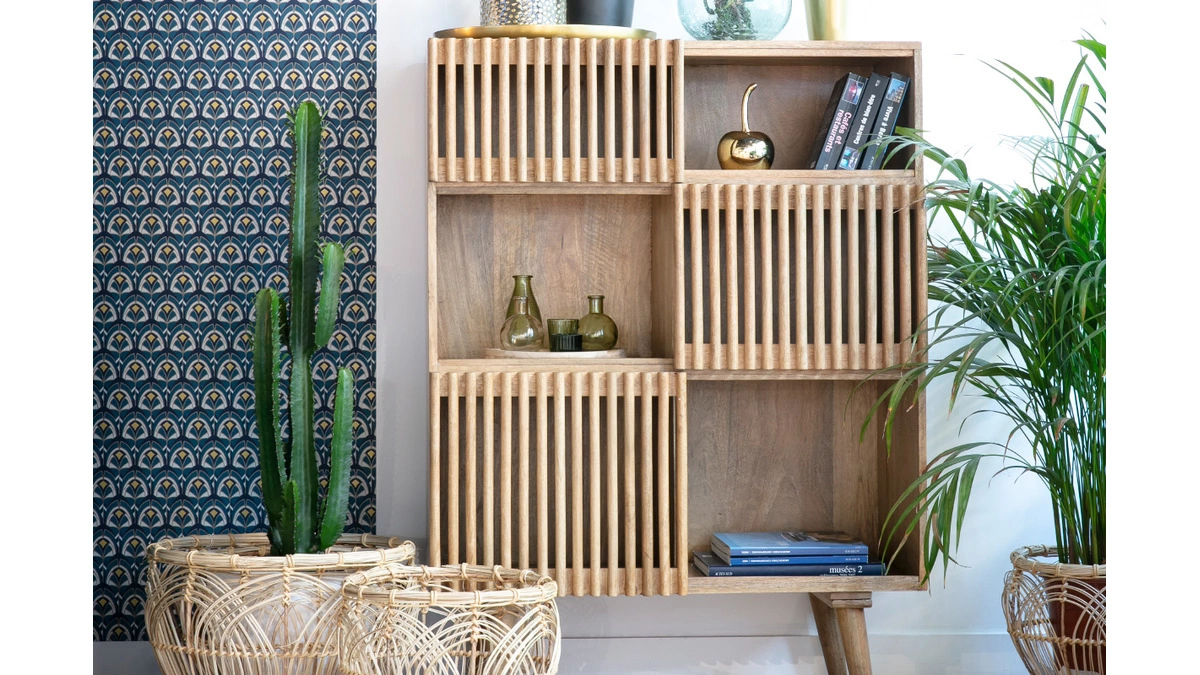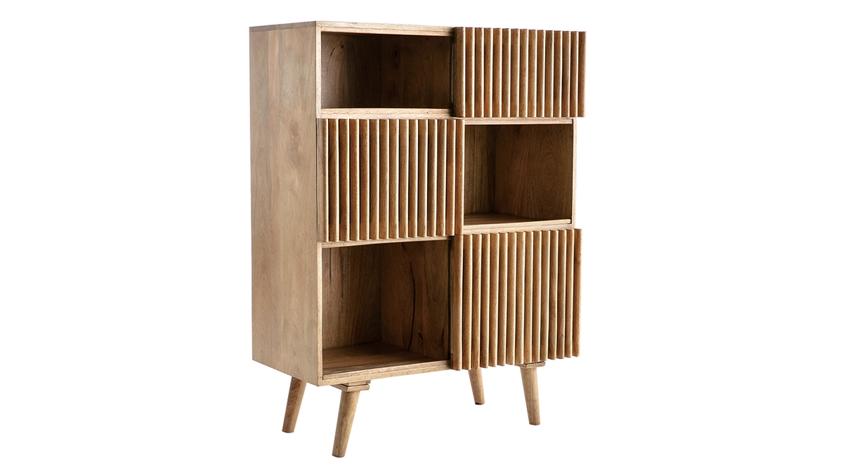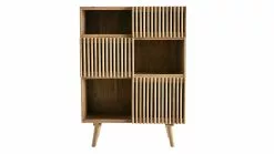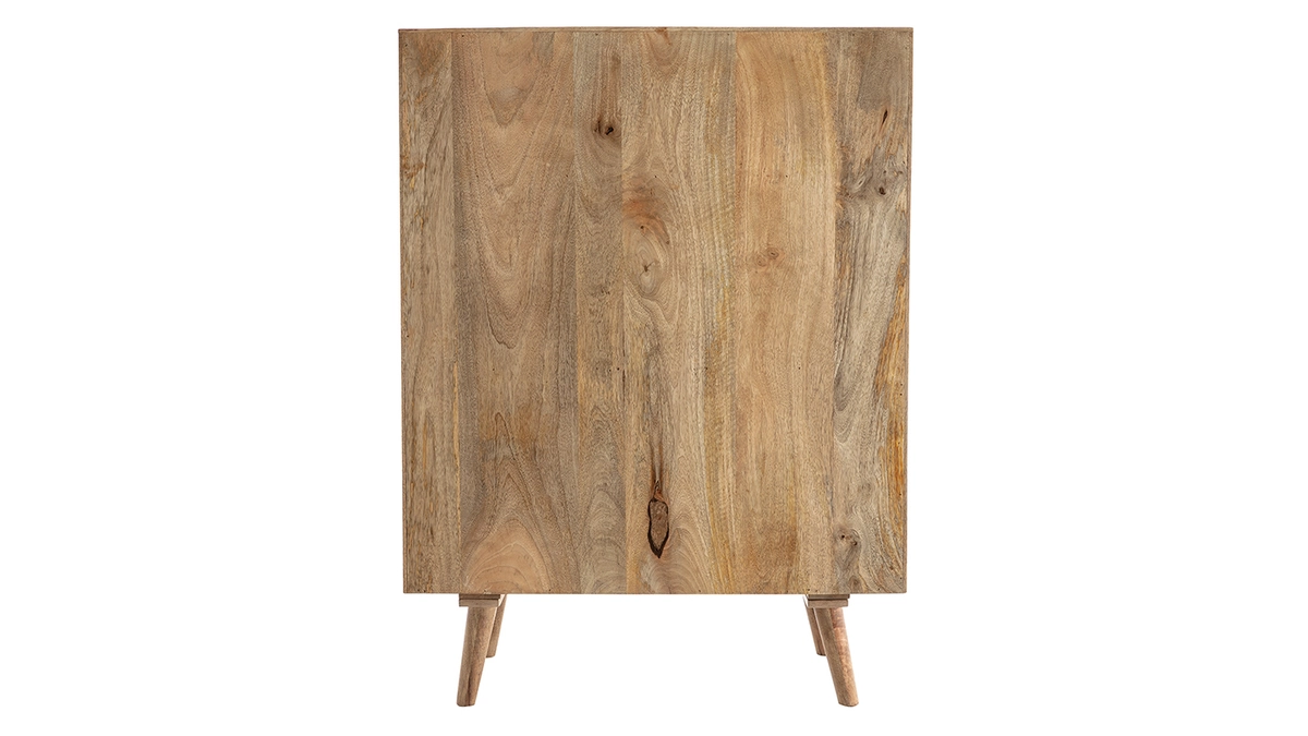 Sa structure est réalisée intégralement en bois massif selon des techniques artisanales. L’utilisation du manguier associé au “fait main” donne à ce meuble un aspect unique et chaleureux. Pour apporter de la légèreté à ce meuble en bois, un piètement haut et fin a été ajouté et les rangements ont été fermés par des portes ajourées. Les barreaux créent un effet graphique original.