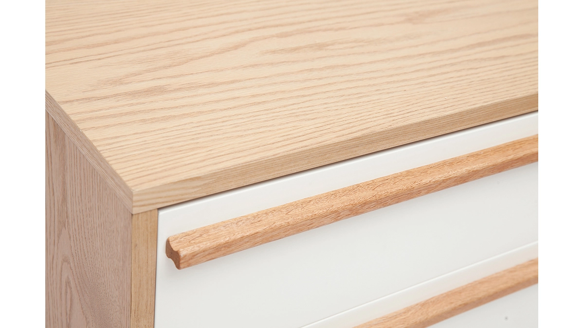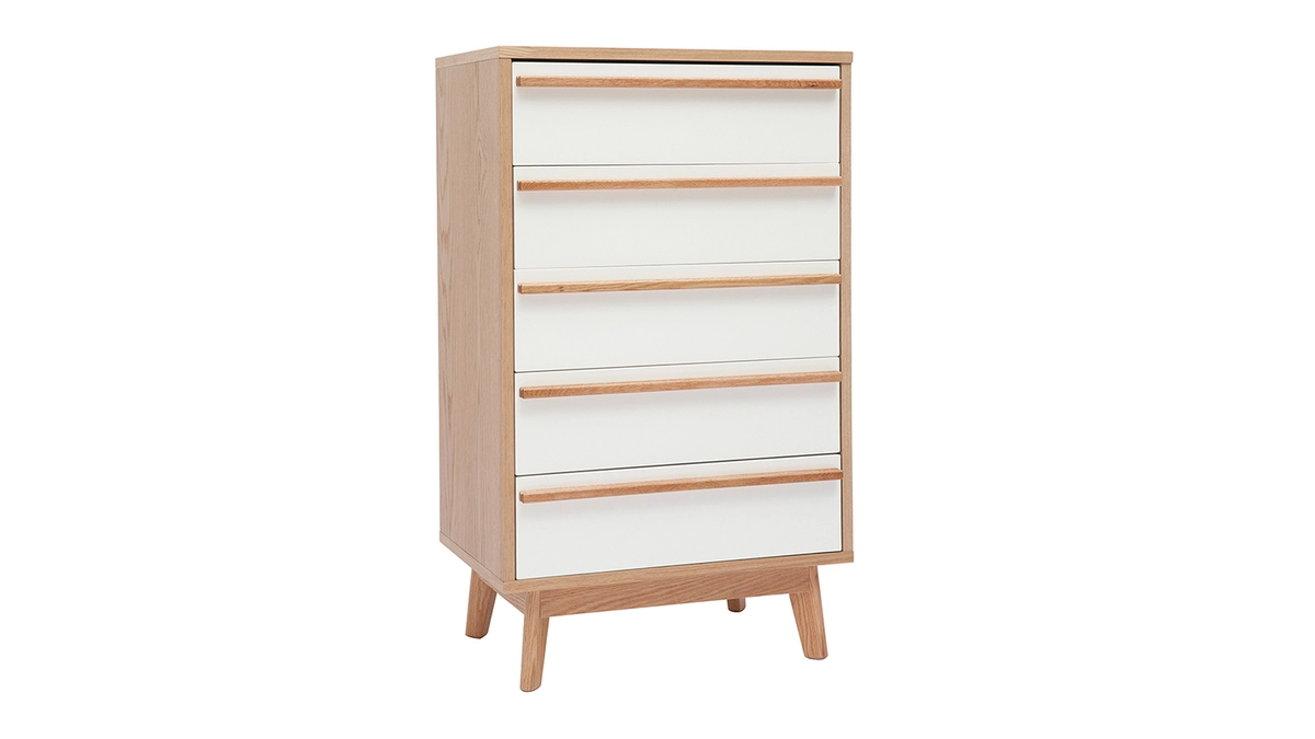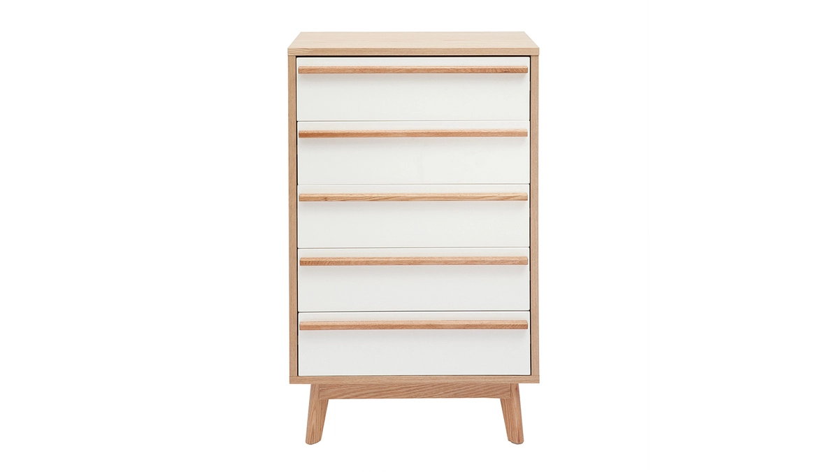 Fabriquée à partir de panneaux de fibres de bois placage chêne et finition blanc mat, cette commode à tiroirs compte pas moins de cinq spacieux rangement tiroirs (L50.5 x P30.5 x H10 cm). Un ensemble supporté par un piètement en chêne massif, gage de stabilité et robustesse.