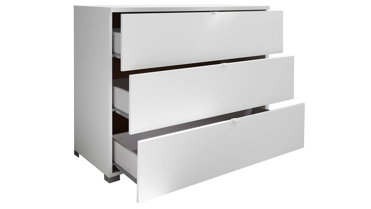 Avec ses dimensions compactes L104 x P45.3 x H80 cm et son design épuré : cette commode blanche reprend les codes de l’esthétique minimaliste dans une version gain de place ultra fonctionnelle. Equipée de trois grands tiroirs, ce meuble de rangement permet d’organiser les affaires de la chambre sans l’encombrer. Des poignées métalliques facilitent l’ouverture et la fermeture de chaque espace de rangement (L100 x P41.5 x H24.6 cm). Pratique et discrète, cette commode moderne s’adapte à tous les coins nuit.