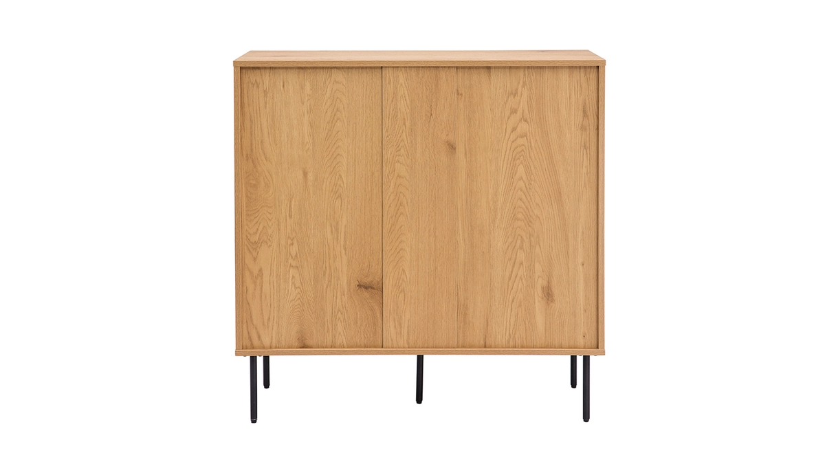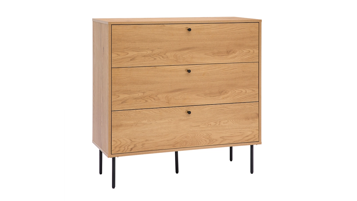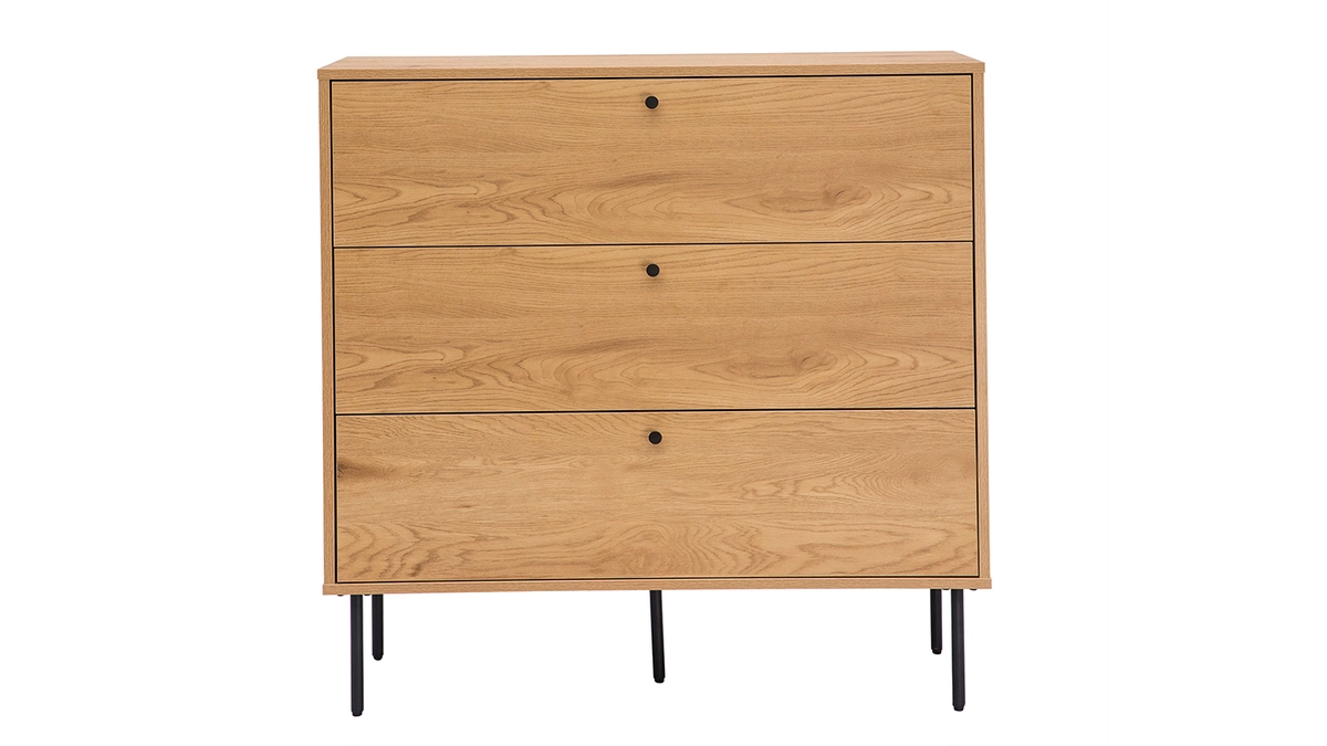 Avec ses lignes sobres et épurées, cette commode en bois aux dimensions L100 x P40 x H100 cm se plie à tous les styles de déco. La finition chêne (panneaux de fibre de bois mélaminé) se caractérise par de jolies nuances dorées ainsi que des noeuds et veines marqués. On aime le contraste entre le côté chaleureux et authentique du bois et le travail fin du métal. Le piètement métallique haut de 20 centimètres en métal noir permet de libérer de la place au sol et d’élever le meuble pour plus d’esthétisme.