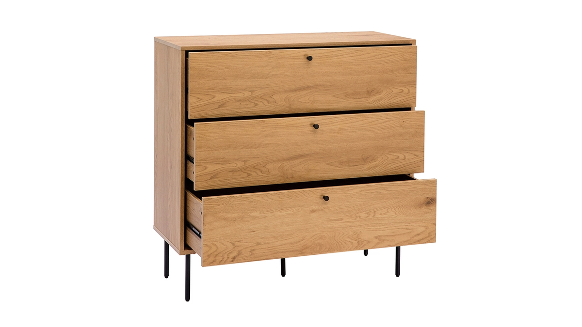 Cette commode à tiroirs – à la fois compacte et équipée de larges rangement – est l’alliée des petites chambres en quête de modernité. Elle pourra également habiller une entrée ou un couloir tout en longueur. Ses trois tiroirs (dimensions intérieures L92 x P33.5 x H18 cm) sont assez grands pour accueillir vos vêtements, votre linge de maison, des accessoires de mode ou des documents en fonction de son utilité.
