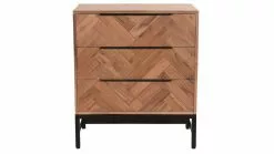 Mêlant avec élégance une structure en acacia massif, un dos en panneaux de fibres de bois et un piètement en acier, cette pièce de mobilier habillera avec charme et personnalité votre chambre à coucher ou votre salon. Le bois massif réchauffera votre intérieur en un clin d’oeil, tandis que le métal noir apportera une petite touche indus’ des plus tendance. On aime particulièrement le motif chevrons qui se dessinent sur les tiroirs. Il donne à l’ensemble un style original et raffiné. Conçue de manière artisanale, cette commode offre un rendu brut unique.