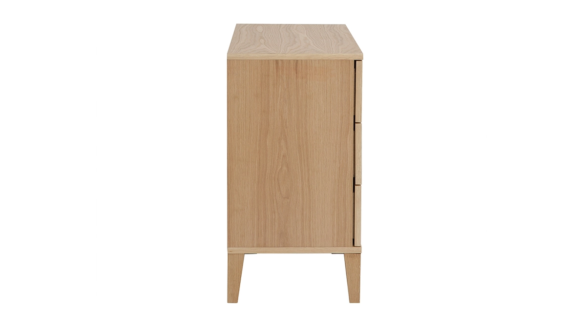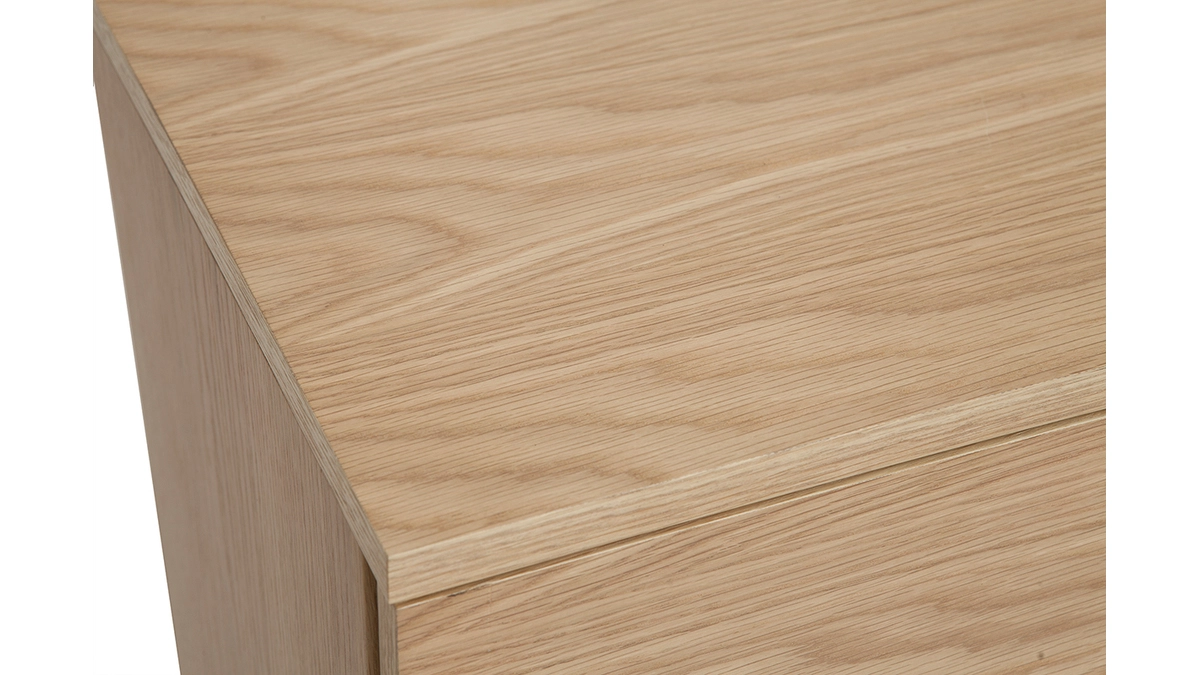 Au premier coup d’oeil, cette commode en bois clair donne le ton d’une pièce de mobilier scandinave ultra chaleureuse. Une structure en panneaux de fibres de bois placage chêne, des pieds en chêne massif : voici un meuble de rangement qui mise sur un total look bois pour réchauffer votre décoration d’intérieur avec style !