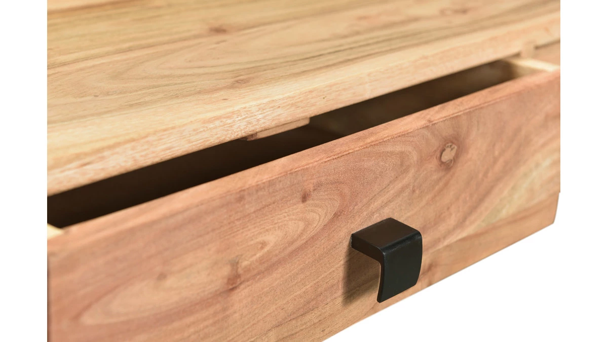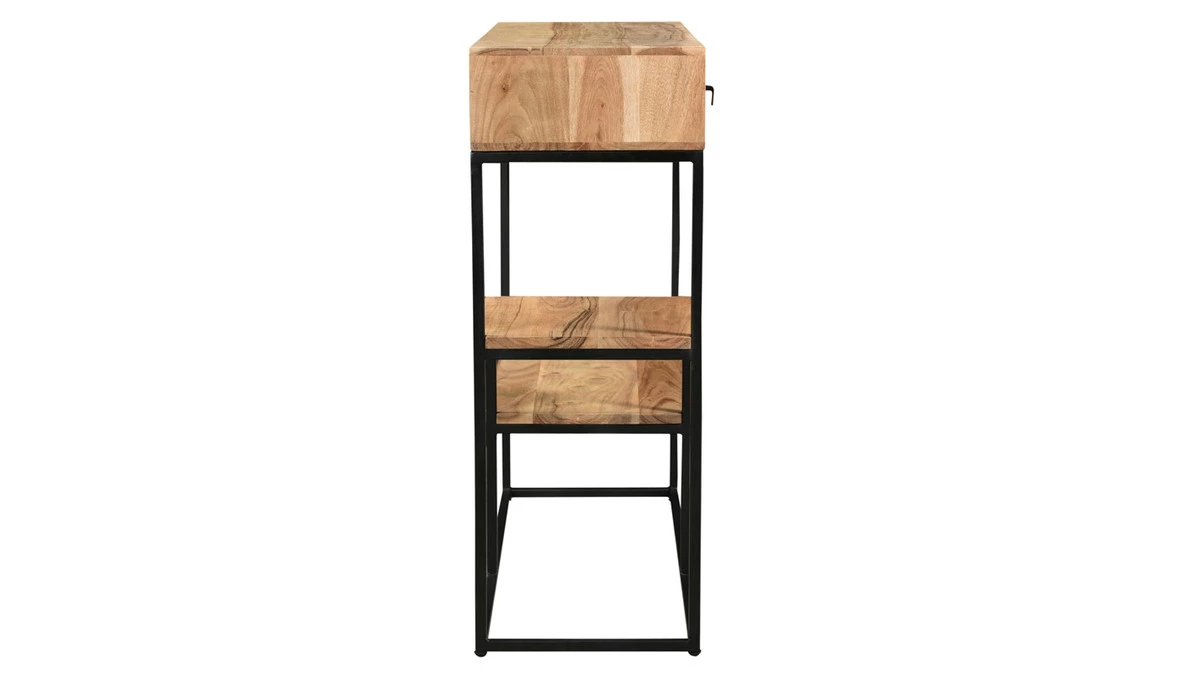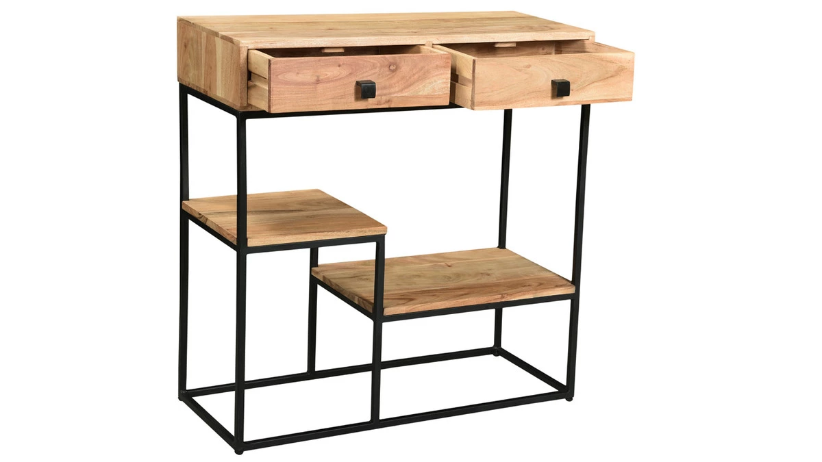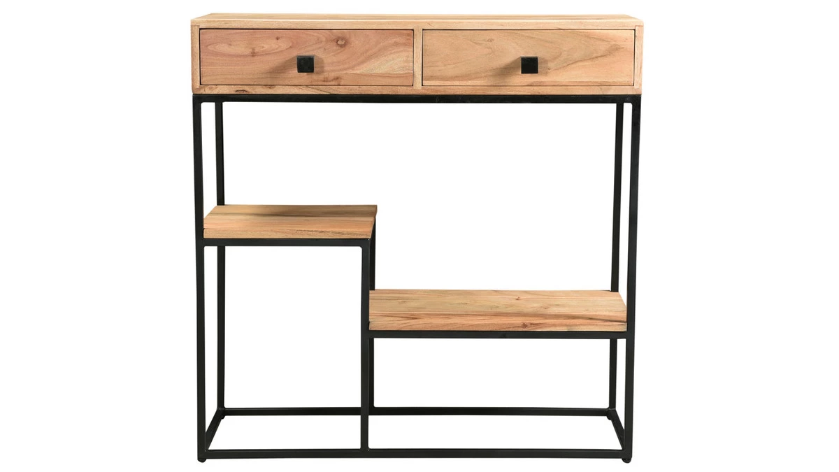 Composée d’une structure en métal et de différents plateaux en acacia, cette console en bois et métal noir munie de 2 tiroirs et 2 plateaux étagères vous accompagne autant dans une entrée que dans un pièce de vie. Idéale pour se concocter un coin déco tout en organisant l’espace, cette console avec rangements offre des espaces fermés et ouverts pour garder à portée de mains les objets du quotidien !