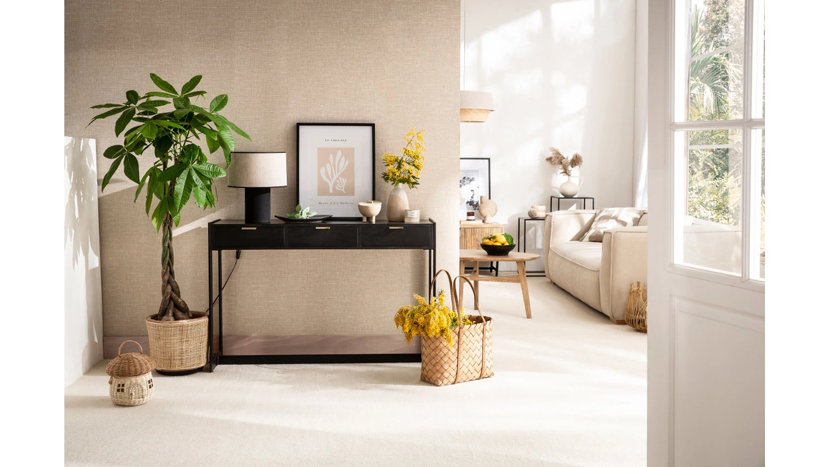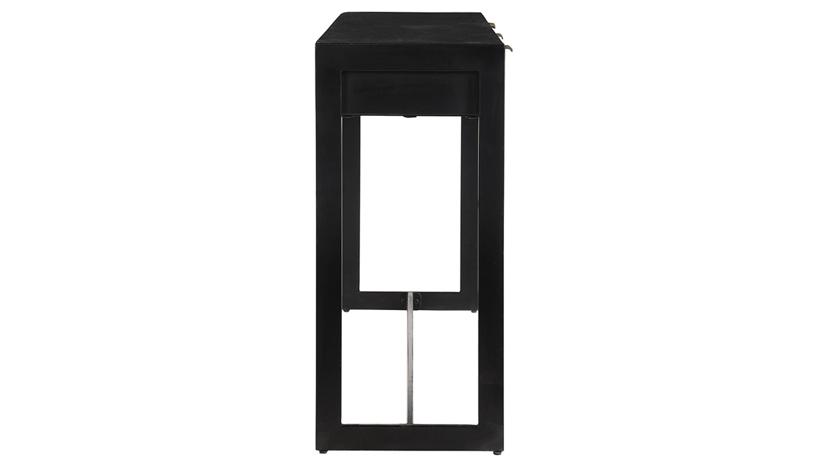 Habillée d’un magnifique monochrome noir, cette console est un symbole de sobriété et d’élégance. Elle combine un plateau en acacia massif et panneaux de fibres de bois avec un solide piètement en métal assorti. Ce mélange, gage de robustesse et d’authenticité, a toute sa place dans un intérieur tendance. Des détails dorés sur les tiroirs se détachent du noir profond et apportent une touche d’éclat à cet ensemble épuré. AVIDAN est une magnifique console réalisée artisanalement. Ses imperfections naturelles propres aux pièces faites à la main font tout son charme.