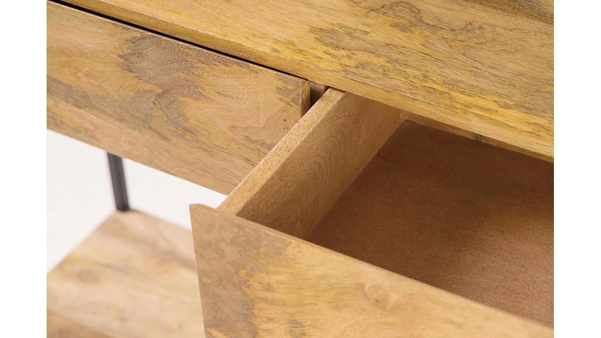 Cette console industrielle conçue en manguier massif dispose de finitions exemplaires. Piètement en métal et structure en bois massif, l’harmonie est parfaite entre les deux matériaux. Un mariage de matières et couleurs qui offre un rendu final magnifique ! Facile d’entretien, une couche de vernis a été appliquée dans le but de protéger ce meuble. Équipée de 2 tiroirs et d’un plateau inférieur, cette console avec rangements pourra aisément être placée dans votre hall d’entrée pour accueillir vos clés, votre sac à main, votre courrier…