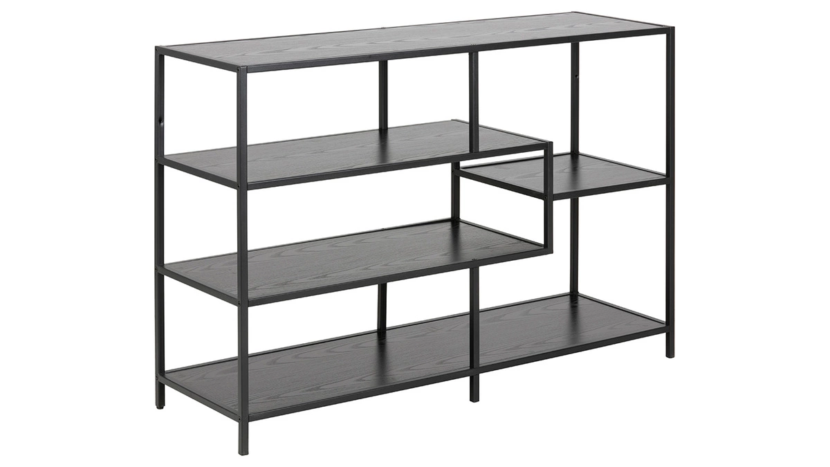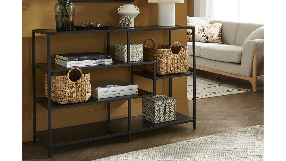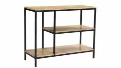C’est la forme destructurée du meuble TRESCA qui fait son charme. Sa structure en métal dessine des niches de rangement de tailles et hauteurs différentes offrant un rendu graphique et original. L’ensemble est complété par des étagères en panneaux de fibres de bois pour un effet bimatière chaleureux et tendance. Avec son total look noir, cette console est un intemporel, facile à intégrer chez soi.
